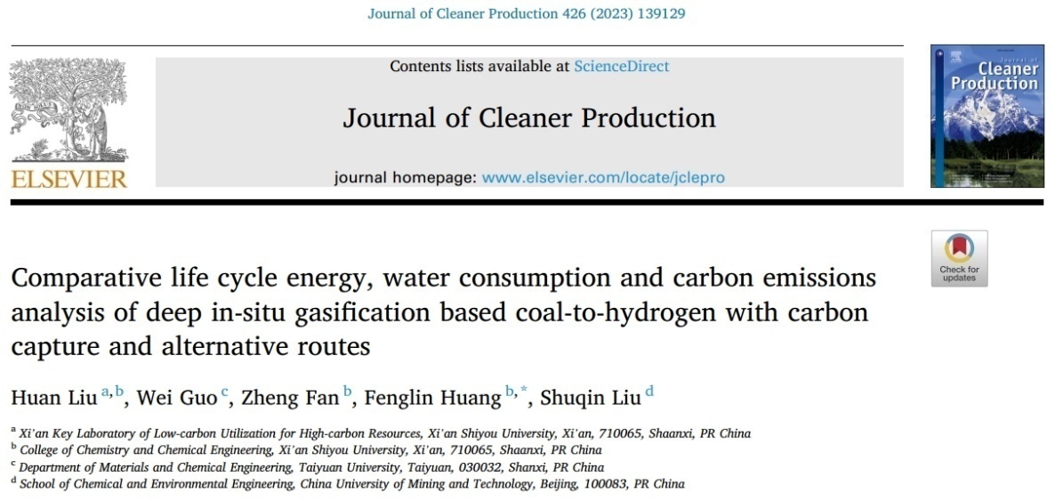 近日,我校化學(xué)化工學(xué)院黃風(fēng)林、劉歡科研團(tuán)隊(duì)以劉歡為第一作者、西安石油大學(xué)為第一單位在能源環(huán)境領(lǐng)域國(guó)際權(quán)威學(xué)術(shù)期刊《Journal of Cleaner Production》(JCR、中科院分區(qū)雙一區(qū)TOP期刊,IF=11.1)上發(fā)表題為《Comparative life cycle energy, water consumption and carbon emissions analysis of deep in-situ gasification based coal-to-hydrogen with carbon capture and alternative routes》的高水平論文。