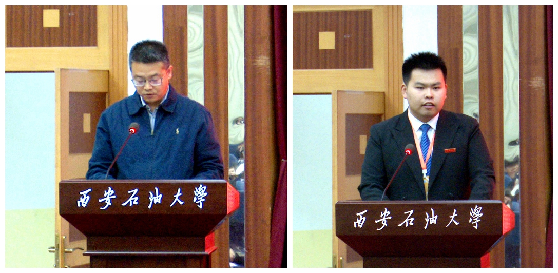 楊俊宣讀獲獎(jiǎng)學(xué)生名單及表彰文件;本屆獲獎(jiǎng)學(xué)生代表姬祥飛作交流發(fā)言