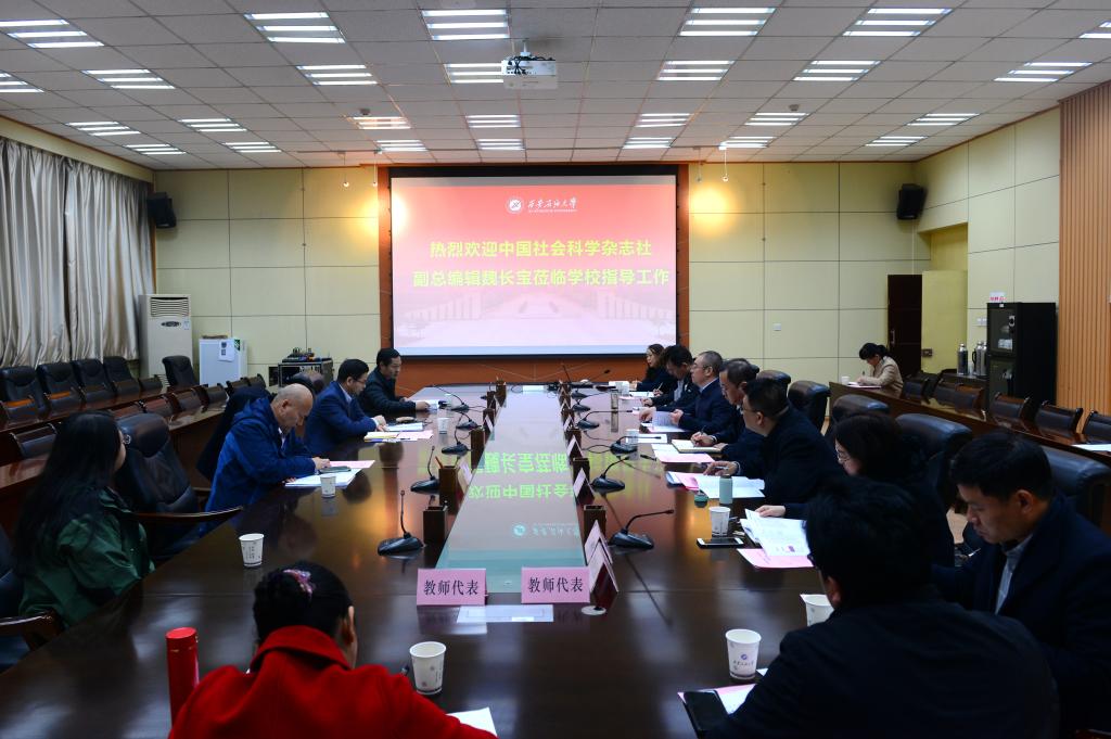 魏長寶簡要介紹了中國社會科學雜志社的指導思想和辦刊理念以及在培育選題、培育文章、培育作者等方面的工作情況。并希望通過此次調研,深入了解學校人文社科發(fā)展基本狀況與教師承擔的科研項目情況,也希望老師們多關注雜志社相關報刊網絡,多參與雜志社相關學術交流活動,循序漸進、有針對性地積極投稿。