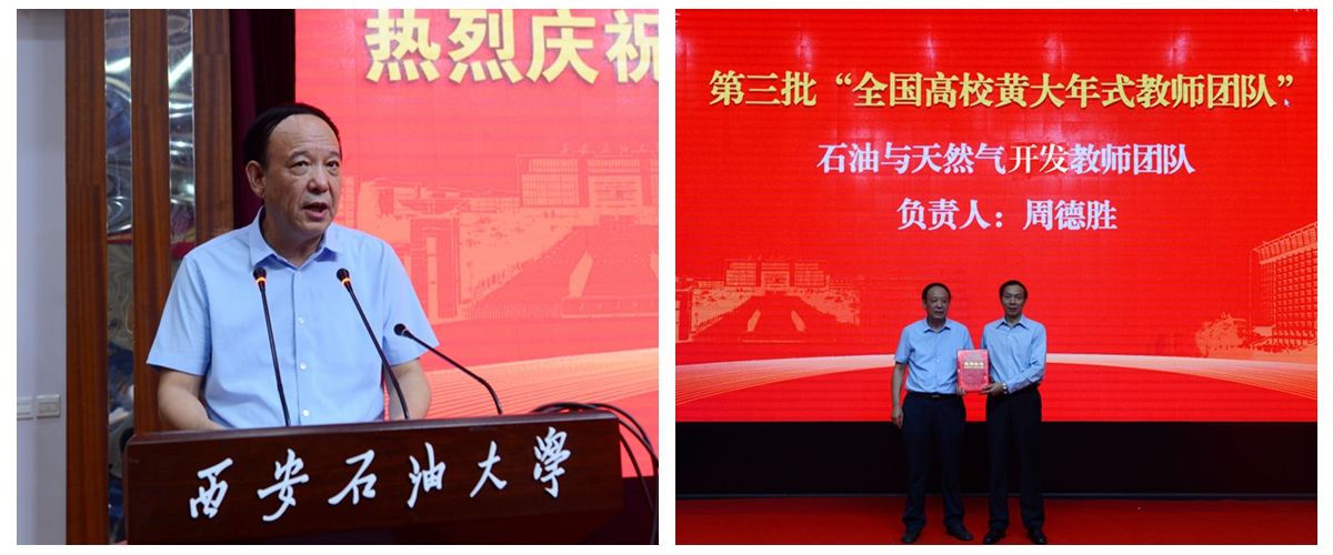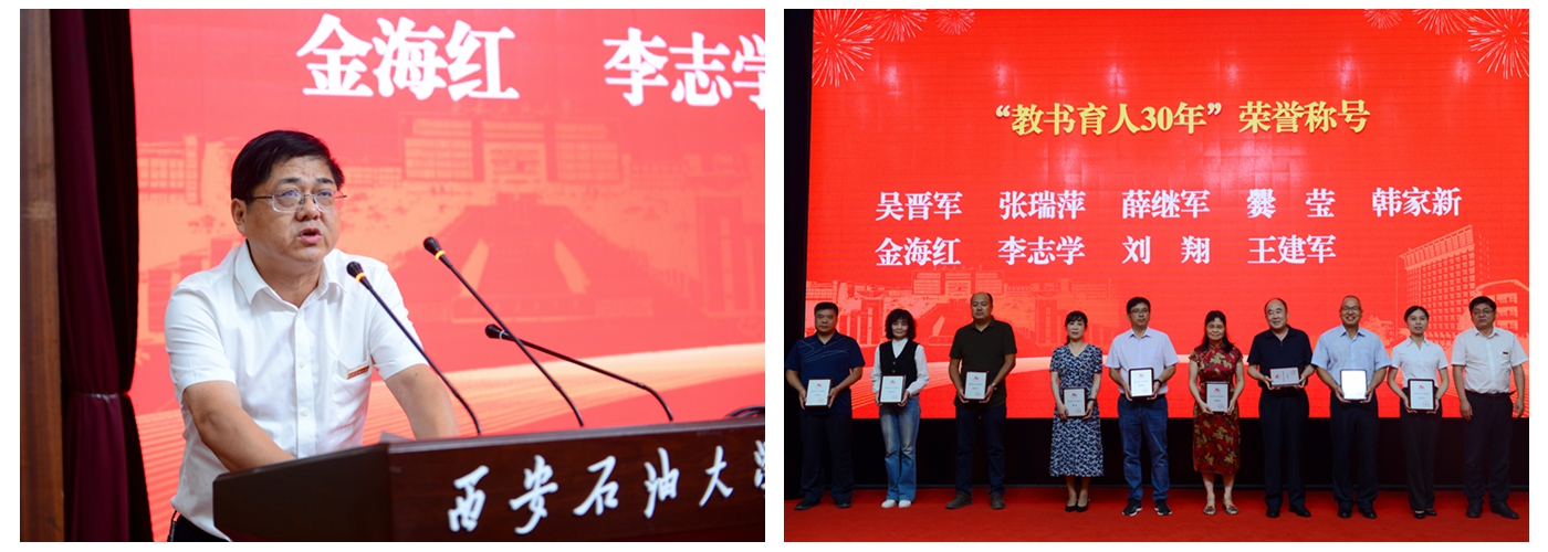 會上,校黨委書記賽云秀宣讀了《教育部關(guān)于公布第三批“全國高校黃大年式教師團隊”創(chuàng)建示范活動入圍名單的通知》《陜西省教育廳關(guān)于公布第二批陜西省高校黃大年式教師團隊的通知》,并為獲獎團隊頒獎;校長李天太宣讀了《教育部關(guān)于公布第二批國家級一流本科課程認定結(jié)果的通知》和2021-2022年度省科學技術(shù)獎獲獎項目名單,并為獲獎團隊和個人頒獎;校黨委副書記、紀委書記、監(jiān)察專員李延平宣讀了《陜西省教育廳關(guān)于表彰第十三屆陜西普通本科高等學校教學名師獎獲獎教師的通知》,并為獲獎教師頒獎;校黨委副書記張木宣讀了《中共陜西省委教育工委 陜西省教育廳關(guān)于對2022年陜西學校思政課教師“大練兵”主題活動中表現(xiàn)突出教師進行表揚的通知》,并為獲獎?wù)哳C獎;副校長楊戰(zhàn)社宣讀了《陜西省科學技術(shù)廳關(guān)于公布2022年度中青年科技創(chuàng)新領(lǐng)軍人才、科技創(chuàng)新創(chuàng)業(yè)人才及2023年度青年科技新星入選人員的通知》,并為入選者頒獎;副校長程永清宣讀了《中共西安石油大學委員會 西安石油大學關(guān)于表彰2023年師德建設(shè)先進集體和師德先進個人的決定》,并為獲獎教師頒獎;副校長張榮軍宣讀了《中共西安石油大學委員會 西安石油大學關(guān)于表彰2023年優(yōu)秀教師 先進教育工作者的決定》,并為獲獎教師代表頒獎;總會計師樊曉民宣讀了《西安石油大學關(guān)于表彰獎勵“教書育人30年”教師的決定》,并為獲獎教師頒獎。