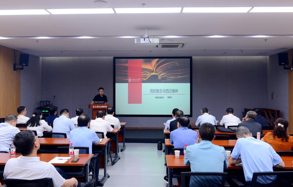 在實(shí)踐研學(xué)現(xiàn)場(chǎng)教學(xué)環(huán)節(jié),校黨委理論學(xué)習(xí)中心組(擴(kuò)大)在交大西遷博物館報(bào)告廳聽(tīng)取了專題黨課。西安交通大學(xué)校史與大學(xué)文化研究中心副研究館員、西遷精神宣講團(tuán)專家組成員楊瀾濤博士以《黨的意志與西遷精神》為題,對(duì)黨中央決策西遷的歷程及影響進(jìn)行了詳細(xì)講解。在交大西遷博物館,研學(xué)人員通過(guò)實(shí)地參觀和聆聽(tīng)講解員介紹,回顧了交通大學(xué)的西遷征程,領(lǐng)略了交大興學(xué)強(qiáng)國(guó)、崇德尚實(shí)的學(xué)風(fēng)與“起點(diǎn)高、要求嚴(yán)、基礎(chǔ)厚、重實(shí)踐”的優(yōu)良辦學(xué)傳統(tǒng),學(xué)習(xí)了“西遷人”感人至深的先進(jìn)事跡,體會(huì)了以“胸懷大局、無(wú)私奉獻(xiàn)、弘揚(yáng)傳統(tǒng)、艱苦創(chuàng)業(yè)”為核心內(nèi)涵的西遷精神。