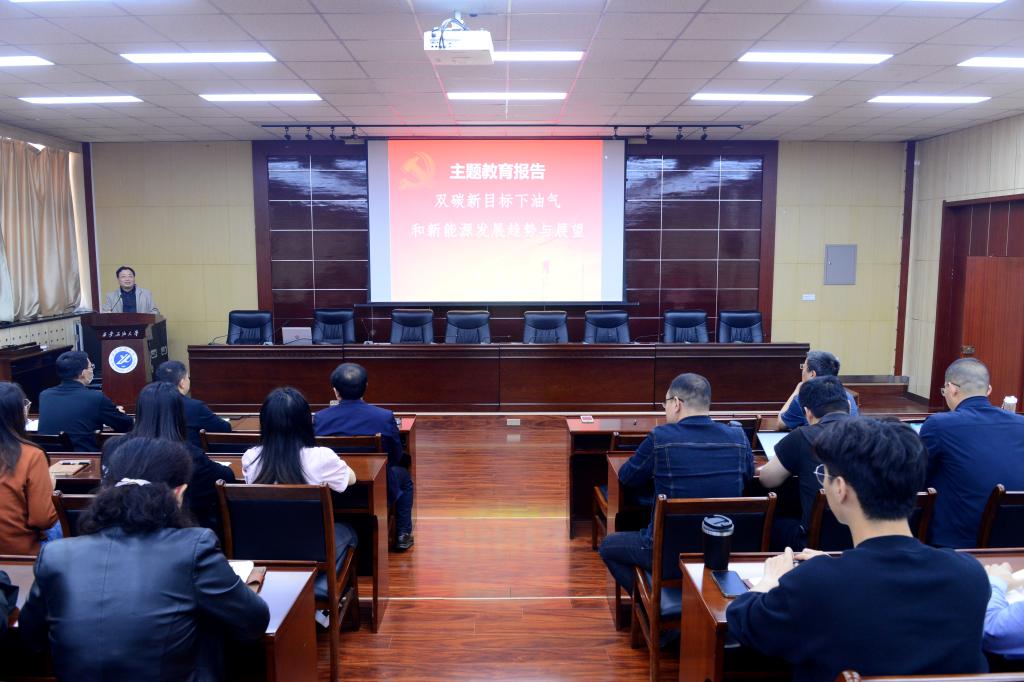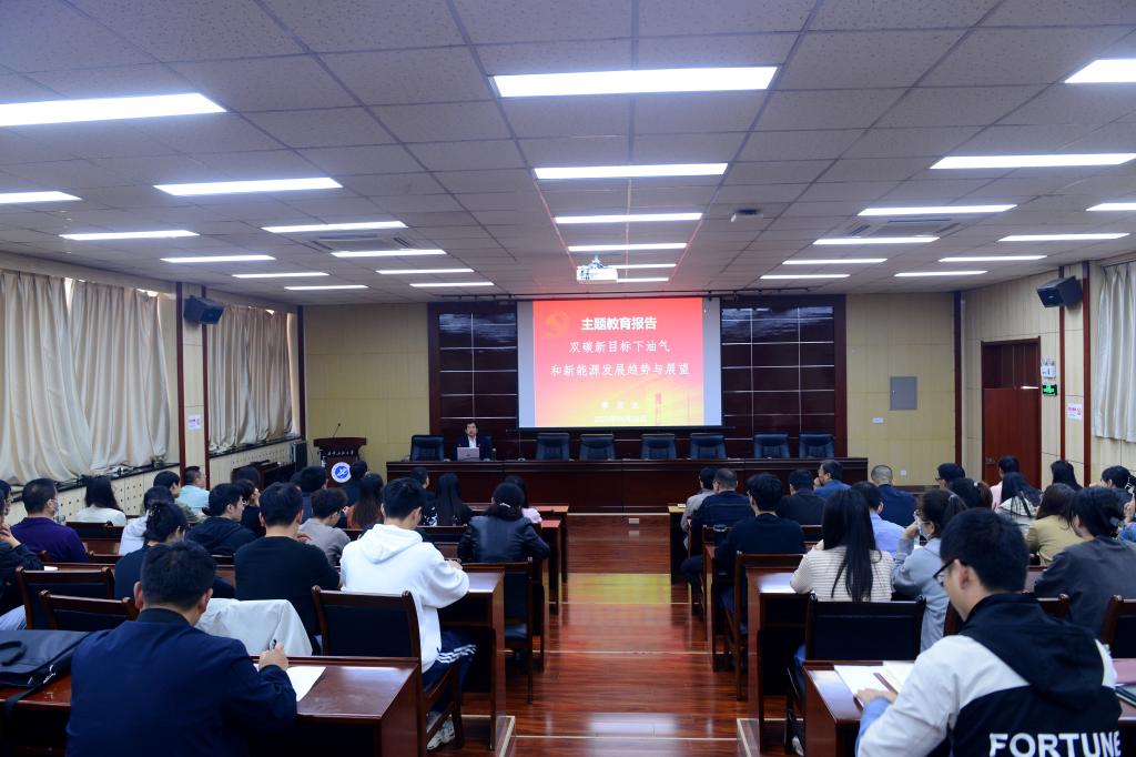 李天太在講授中強(qiáng)調(diào)了本次學(xué)習(xí)貫徹習(xí)近平新時(shí)代中國(guó)特色社會(huì)主義思想主題教育的總要求、根本任務(wù)、5個(gè)目標(biāo)、著力解決6個(gè)方面突出問(wèn)題,并從雙碳新目標(biāo)、世界油氣發(fā)展趨勢(shì)、我國(guó)油氣發(fā)展趨勢(shì)、石油天然氣勘探開(kāi)發(fā)關(guān)鍵技術(shù)和新能源發(fā)展展望五個(gè)方面出發(fā),指出當(dāng)前我國(guó)正處于實(shí)現(xiàn)“雙碳”目標(biāo)、構(gòu)建“清潔低碳、安全高效”能源體系的關(guān)鍵時(shí)期,做好“碳達(dá)峰、碳中和”工作要加快調(diào)整優(yōu)化產(chǎn)業(yè)結(jié)構(gòu)、能源結(jié)構(gòu)。我校作為以石油石化為特色的多科性普通高等學(xué)校,要深刻把握新能源技術(shù)發(fā)展水平與趨勢(shì),始終推進(jìn)學(xué)校向高水平教學(xué)研究型大學(xué)邁進(jìn),持續(xù)強(qiáng)化和拓展學(xué)校優(yōu)勢(shì)學(xué)科領(lǐng)域、落實(shí)“雙一流”建設(shè),堅(jiān)持立德樹(shù)人根本任務(wù),堅(jiān)持科技創(chuàng)新“四個(gè)面向”,著力培養(yǎng)“三和”+“三碳”人才,服務(wù)于國(guó)家能源建設(shè)。