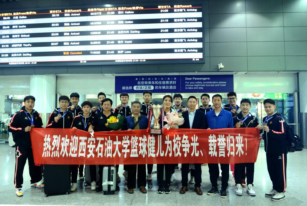 據(jù)悉,當(dāng)天下午,體育學(xué)院倪振文、李壽邦一行前往西安咸陽國(guó)際機(jī)場(chǎng)接機(jī),晚上10:20左右接機(jī)大巴車到達(dá)雁塔校區(qū)?!盁崃覛g迎西安石油大學(xué)籃球健兒為校爭(zhēng)光、載譽(yù)歸來!”歡迎儀式從隊(duì)員下車開始,獻(xiàn)花隊(duì)伍為每名教練組成員和隊(duì)員獻(xiàn)上鮮花。