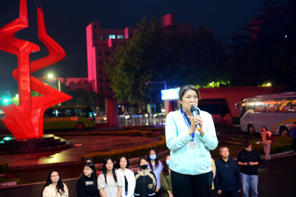 主教練秦香代表球隊(duì)教練組發(fā)言。她表示,對(duì)學(xué)校組織的歡迎儀式感到無比榮耀,對(duì)多年來給予籃球隊(duì)大力支持的各級(jí)領(lǐng)導(dǎo)和部門表示感謝。她回憶起多年執(zhí)教之路,感慨萬千,泣不成聲,同時(shí)希望隊(duì)員們?cè)俳釉賲?,更加進(jìn)步。隨后秦香為李天太、張木、陳軍斌三位校領(lǐng)導(dǎo)贈(zèng)送本屆比賽季軍獎(jiǎng)牌。
