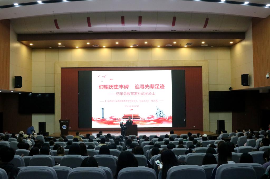 5月10日下午,由校團(tuán)委主辦的第七十七期明德大講堂在鄠邑校區(qū)弘石學(xué)術(shù)報(bào)告廳舉行。陜西省杜斌丞教育思想研究會(huì)會(huì)長(zhǎng)、杜斌丞烈士之孫杜芳濱應(yīng)邀作了題為《仰望歷史豐碑 追尋先輩足跡——記革命教育家杜斌丞烈士》的講座,400余名師生現(xiàn)場(chǎng)聆聽(tīng)報(bào)告。