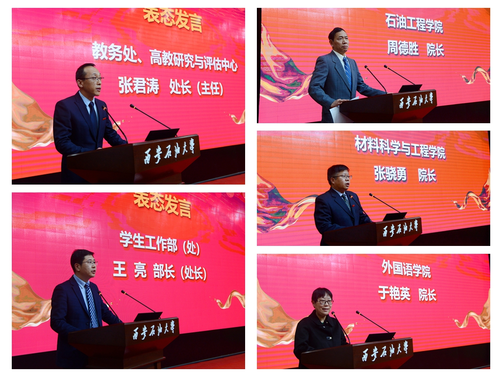 教務(wù)處、學(xué)生工作部、石油工程學(xué)院、材料科學(xué)與工程學(xué)院、外國(guó)語(yǔ)學(xué)院主要負(fù)責(zé)人分別代表各職能部門(mén)和院(系)發(fā)言,他們表示將積極組織單位全體師生深入學(xué)習(xí)新一輪本科教育教學(xué)審核評(píng)估方案和要求,按照學(xué)校審核評(píng)估工作方案要求和此次本科教育教學(xué)審核評(píng)估工作部署推進(jìn)會(huì)會(huì)議精神,做好各項(xiàng)工作安排部署,全面落實(shí)立德樹(shù)人根本任務(wù),保質(zhì)保量按時(shí)完成各項(xiàng)審核評(píng)估工作。