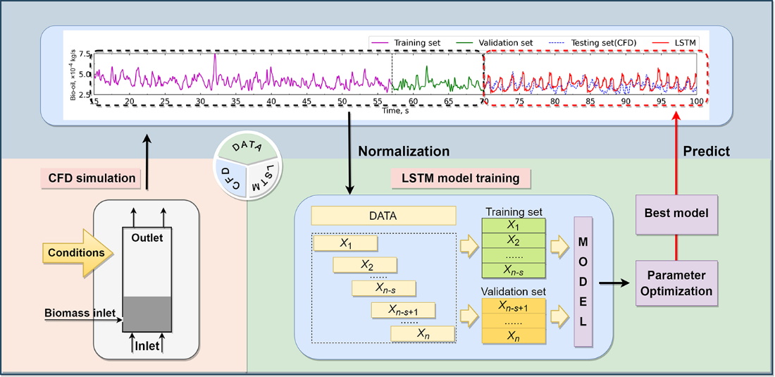 該研究成果基于精準(zhǔn)的生物質(zhì)流化床快速熱解CFD模擬數(shù)據(jù),結(jié)合深度學(xué)習(xí)模型開發(fā)了一種基于長短期記憶神經(jīng)網(wǎng)絡(luò)的CFD模擬智能加速方法。該方法能夠快速預(yù)測反應(yīng)器出口的產(chǎn)品流率,在保證足夠高預(yù)測精度的前提下降低至少30%的CFD計(jì)算需求,同時(shí)對(duì)不同工況均具有良好的適用性。研究成果為流化床生物質(zhì)快速熱解反應(yīng)器的智能設(shè)計(jì)優(yōu)化提供了一條重要途徑,能夠促進(jìn)生物質(zhì)資源高效利用技術(shù)的開發(fā)及應(yīng)用,有助于我國“雙碳”目標(biāo)的實(shí)現(xiàn)。