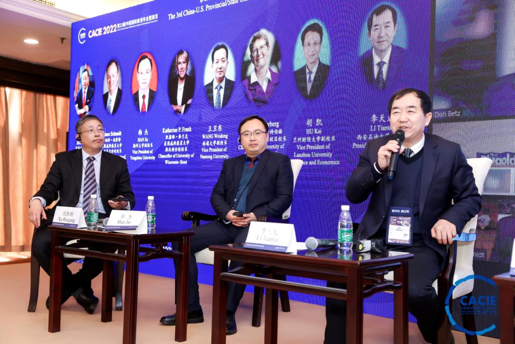作為本屆年會的重要組成部分,第三屆中美省州大學校長論壇以線上+線下形式舉行,來自170多所中美高校的代表出席,邀請中美12所高校的校長作為發(fā)言和研討嘉賓。我校校長李天太是陜西高校唯一特邀論壇嘉賓。論壇主題為探索中美省州大學產(chǎn)教融合新模式,提高國際化人才培養(yǎng)質(zhì)量,服務地方經(jīng)濟社會新發(fā)展。論壇研討內(nèi)容包括以中美學分互認、學位聯(lián)授項目為基礎,以國際化人才培養(yǎng)為紐帶,構建高水平、寬領域、可持續(xù)的中美省州高校合作交流平臺。通過教育國際交流打造適應國家發(fā)展需求的新工科、新農(nóng)科、新商科等高質(zhì)量專業(yè)學科群,建設具有國際化水平的師資隊伍,加強中美高校之間學術科研合作,通過產(chǎn)教融合模式強化合作共贏理念,推進中美省州高校教育交流、人才培養(yǎng)、校企合作、科研合作、人文交流等,為地方經(jīng)濟社會發(fā)展服務。