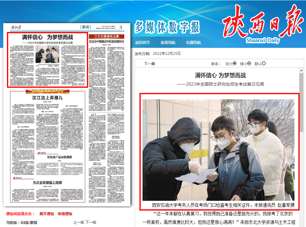 學(xué)校研究生招生考試得到了陜西日報(bào)、陜西廣播電視臺、“學(xué)習(xí)強(qiáng)國”陜西學(xué)習(xí)平臺、澎湃新聞、華商報(bào)、陜西省教育廳官微等省級主流媒體和上級部門的多次報(bào)道,其中,12月25日、26日,陜西日報(bào)兩次報(bào)道學(xué)??紕?wù)工作,取得了較好的社會反響。