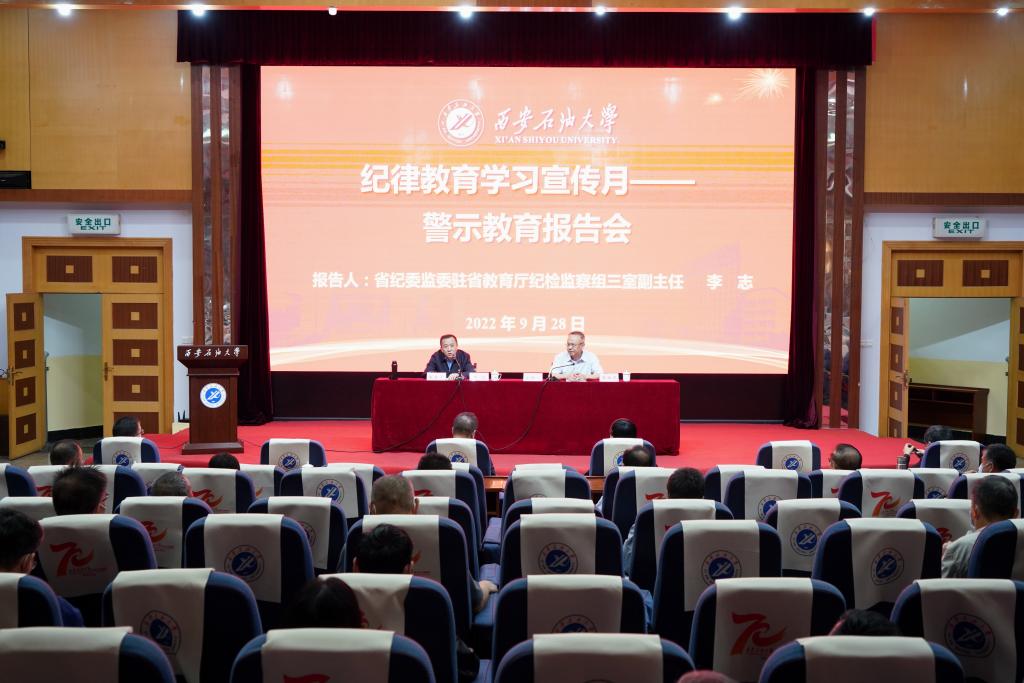 為深入學習貫徹習近平總書記關于全面從嚴治黨的重要論述,認真落實校黨委關于開展作風建設專項行動實施方案有關要求,進一步推進紀律教育學習宣傳月活動,9月28日下午,學校紀委舉辦警示教育專題報告會。報告會在雁塔和鄠邑校區(qū)設立1個主會場和2個分會場,陜西省紀委監(jiān)委駐省教育廳紀檢監(jiān)察組副組長張佳,校領導、全體處級干部、院(系)級單位黨組織紀檢委員、紀委(監(jiān)察專員辦公室)干部共160余人參加了報告會。報告會由校黨委副書記、紀委書記、監(jiān)察專員李延平主持。