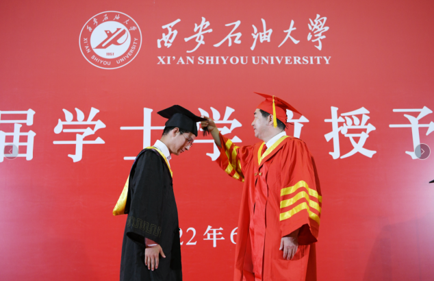 6月27日上午,西安石油大學2022屆優(yōu)秀畢業(yè)生代表學士學位授予儀式在鄠邑校區(qū)弘石學術(shù)報告廳隆重舉行。校長、校學位評定委員會主席李天太,副校長、校學位評定委員會副主席陳軍斌出席學士學位授予儀式。學士學位授予儀式由校黨委副書記、校學位評定委員會副主席張木主持。鄠邑校區(qū)管理辦公室、學生工作處、教務處等相關職能部門負責人、各院(系)負責人、208名優(yōu)秀畢業(yè)生代表參加授位儀式。