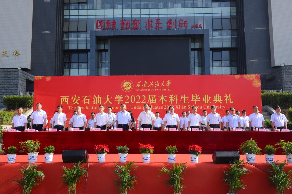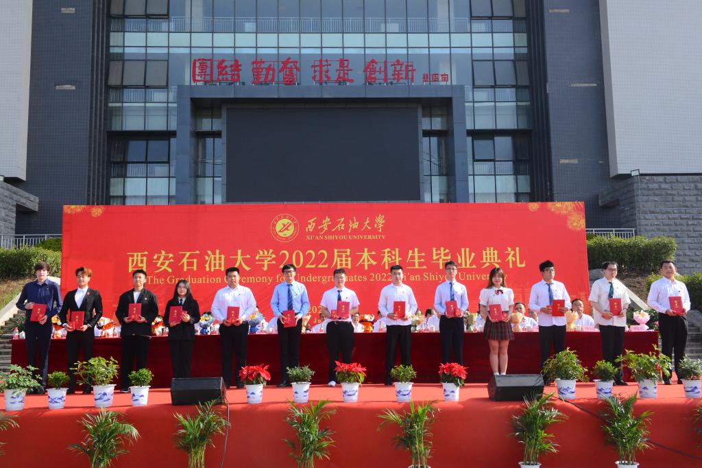 副校長(zhǎng)陳軍斌宣讀了《西安石油大學(xué)關(guān)于2022屆本科學(xué)生準(zhǔn)予畢業(yè)、頒發(fā)畢業(yè)證和授予學(xué)士學(xué)位的決定》,副校長(zhǎng)楊戰(zhàn)社宣讀了《西安石油大學(xué)關(guān)于表彰2022屆優(yōu)秀畢業(yè)生的決定》,校黨委副書(shū)記雷西合宣讀了《西安石油大學(xué)校友總會(huì)關(guān)于聘任2022屆年級(jí)校友理事的決定》。與會(huì)校領(lǐng)導(dǎo)為志愿服務(wù)西部計(jì)劃、榮獲優(yōu)秀畢業(yè)生榮譽(yù)稱號(hào)的學(xué)生代表頒發(fā)了榮譽(yù)證書(shū)并贈(zèng)送了“原油”印章紀(jì)念品,為年級(jí)理事代表頒發(fā)了聘任證書(shū)和紀(jì)念品。