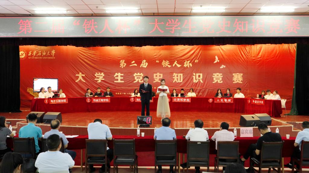 6月13日晚,由馬克思主義學(xué)院、教務(wù)處主辦,組織部、宣傳部、學(xué)工部、校團委協(xié)辦的第二屆“鐵人杯”大學(xué)生黨史知識競賽決賽在鄠邑校區(qū)騰輝大學(xué)生活動中心隆重舉行。校黨委副書記張木出席,相關(guān)部門負(fù)責(zé)人、教師及學(xué)生代表參加本次活動。經(jīng)過兩場初賽,電子工程學(xué)院、石油工程學(xué)院、地球科學(xué)與工程學(xué)院、計算機學(xué)院、人文學(xué)院、外國語學(xué)院六支代表隊進入決賽。