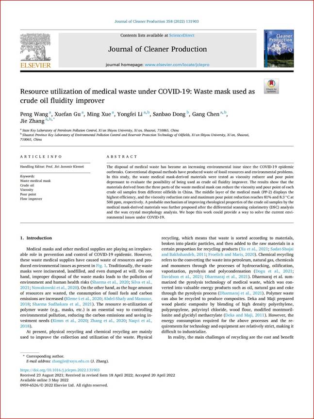 該項研究工作近期以“Resource utilization of medical waste under COVID-19: Waste mask used as crude oil fluidity improver”為題發(fā)表在Journal of Cleaner Production(中科院一區(qū),TOP期刊,2021年IF=9.297)期刊上。張潔教授和顧雪凡教授共同指導(dǎo),碩士研究生王棚為論文第一作者,張潔教授為通訊作者,西安石油大學為第一單位。
