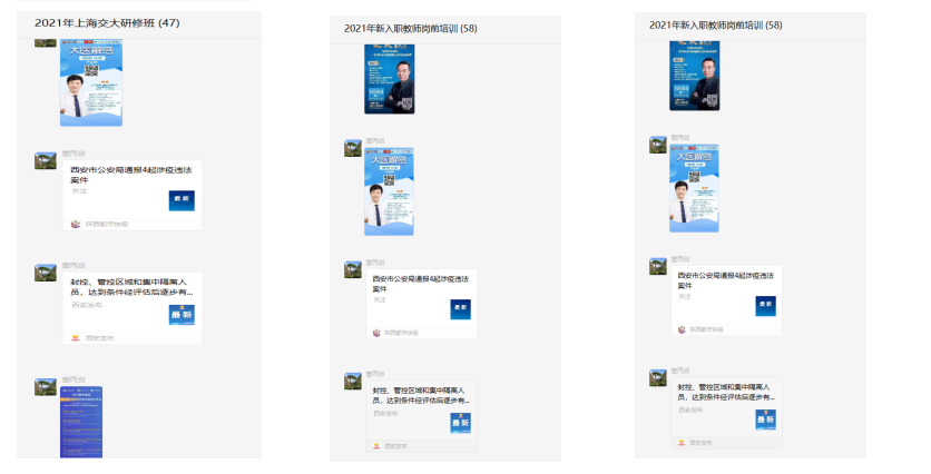 用心服務(wù)教師發(fā)展,助力育人能力提升。聯(lián)合教務(wù)處組織教師開展課程思政專題網(wǎng)絡(luò)學(xué)習(xí),切實提升教師課程思政建設(shè)的意識和能力。按照省教育廳《關(guān)于開展疫情防控期間在線學(xué)習(xí)公益課的通知》要求,依托陜西省教育系統(tǒng)疫情防控期間在線學(xué)習(xí)云平臺,下發(fā)學(xué)習(xí)通知,要求各單位組織管理人員和一線教師開展在線學(xué)習(xí)公益課,助力疫情防控期間“停課不停學(xué)”。轉(zhuǎn)發(fā)上海交通大學(xué)、華東師范大學(xué)聯(lián)合舉辦的“助金課堂”系列講座和全國模范教師、北京師范大學(xué)教授、博士生導(dǎo)師康震教授線上講座通知,切實提升教師教育教學(xué)能力和育人水平。