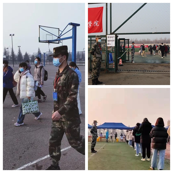 考研臨近,我校為考研學(xué)子提供了核酸檢測(cè)服務(wù)。通知發(fā)出后,退伍大學(xué)生分隊(duì)再次集結(jié),主動(dòng)請(qǐng)求為考研學(xué)子服務(wù)。在我校鄠邑校區(qū)西操場(chǎng)的核酸檢測(cè)現(xiàn)場(chǎng),他們身著綠色軍裝的身影格外醒目,他們中有的人拿著小喇叭,不斷向等候檢測(cè)的隊(duì)伍發(fā)出溫馨提示;有的人穿著厚厚的防護(hù)服,在為前來(lái)檢測(cè)的人員做信息登記;有的人在各個(gè)區(qū)域組織人員分流、有序入場(chǎng)。