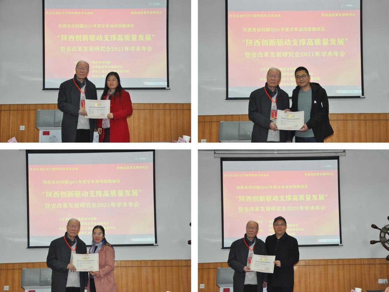 享受國務(wù)院特殊津貼專家、陜西省有突出貢獻專家、陜西經(jīng)貿(mào)學(xué)院原院長、西安財經(jīng)大學(xué)樊光鼎教授對陜西省改革發(fā)展研究會慶祝建黨100周年優(yōu)秀科研成果評獎活動進行了介紹,并宣讀獲獎文件,與獲獎代表合影留念。