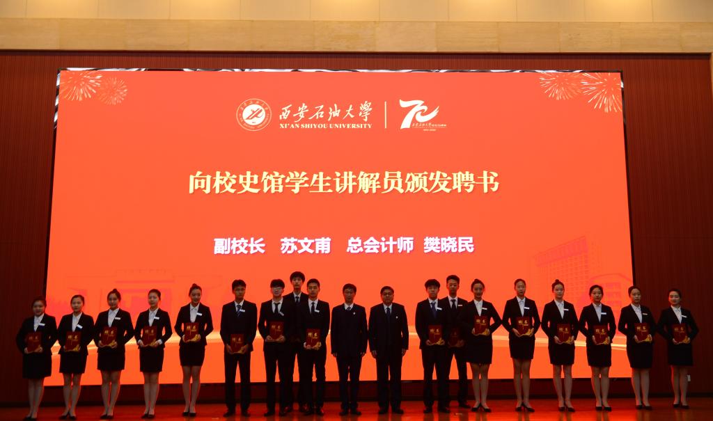 副校長蘇文甫、總會計師樊曉民為17名校史館學生講解員頒發(fā)聘書。