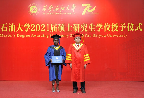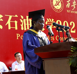 地球科學(xué)與工程學(xué)院高棒棒和石油工程學(xué)院來自加蓬共和國的歐碧麗同學(xué),分別代表2021屆碩士研究生和碩士留學(xué)生在發(fā)言中向悉心培育自己的母校、師長和親人表示感謝,同時表達了自身繼續(xù)努力、續(xù)寫輝煌的信心和決心。