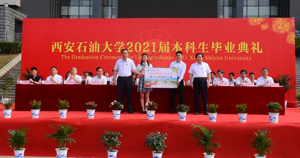 副校長陳軍斌宣讀了《西安石油大學(xué)關(guān)于2021屆本科學(xué)生準(zhǔn)予畢業(yè)、頒發(fā)畢業(yè)證和授予學(xué)士學(xué)位的決定》,副校長楊戰(zhàn)社宣讀了《西安石油大學(xué)關(guān)于表彰2021屆優(yōu)秀畢業(yè)生的決定》,校黨委副書記雷西合宣讀了《西安石油大學(xué)校友總會(huì)關(guān)于聘任2021屆年級(jí)校友理事的決定》。與會(huì)校領(lǐng)導(dǎo)為優(yōu)秀畢業(yè)生代表頒發(fā)了榮譽(yù)證書,為年級(jí)理事代表頒發(fā)了聘任證書和紀(jì)念品,并向畢業(yè)生代表贈(zèng)送了“原油”印章紀(jì)念品。