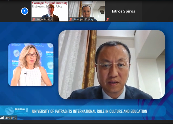據(jù)悉,每年在帕特雷市舉行的希臘區(qū)域發(fā)展論壇是希臘中央政府、地方政府、學(xué)術(shù)界和商界代表之間對話的公共平臺。希臘總統(tǒng)Katerina Sakellaropoulou、總理Kyriakos Mitsotakis、歐盟委員會副主席argaritis Schinas及多個部門的部長出席今年的論壇。此論壇的2021教育分論壇由帕特雷大學(xué)主辦,除我校張榮軍副校長外,帕特雷大學(xué)學(xué)術(shù)和國際事務(wù)副校長Dionissios Mantzavinos、希臘教育部高等教育秘書長Apostolos Dimitropoulos、美國卡耐基梅隆大學(xué)教授Peter Adams等六位嘉賓先后發(fā)言。