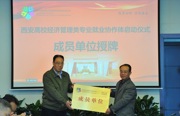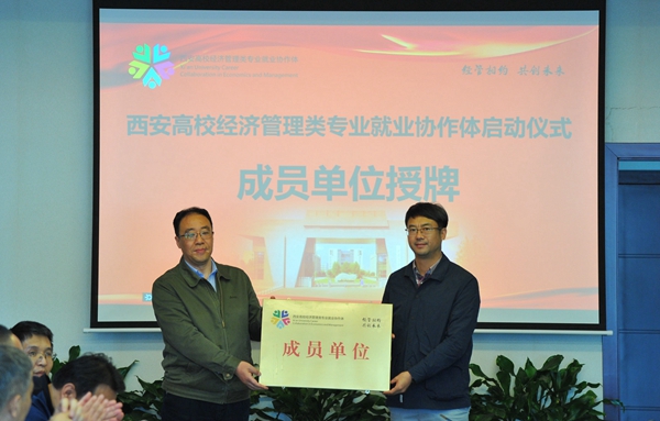 陜西省教育廳高校學(xué)生工作處二級(jí)調(diào)研員胡偉安依次為西安高校經(jīng)濟(jì)管理類專業(yè)就業(yè)協(xié)作體成員單位西安石油大學(xué)、西北政法大學(xué)、西安外國語大學(xué)、西安財(cái)經(jīng)大學(xué)、西安郵電大學(xué)授牌。