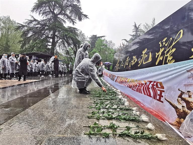 ——43日,陜西省“清明祭英烈”活動(dòng)在西安烈士陵園舉行,西安石油大學(xué)30余名師生代表參加了活動(dòng)。天空飄落著雨滴,“明理增信,崇德力行;興國昌邦,弦歌續(xù)唱”的祭辭在烈士陵園中回蕩。在莊嚴(yán)肅穆的氛圍中,參加活動(dòng)的人們面向烈士紀(jì)念墻默哀、行鞠躬禮,并為革命烈士敬獻(xiàn)鮮花。
