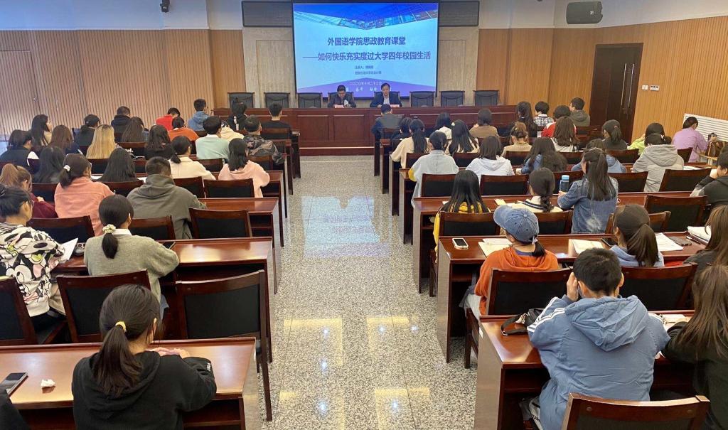 10月23日下午,校領(lǐng)導(dǎo)樊曉民總會(huì)計(jì)師在鄠邑校區(qū)圖書館第一會(huì)議室以“如何快樂充實(shí)度過大學(xué)四年校園生活”為主題,為外國(guó)語學(xué)院師生上了一堂生動(dòng)活潑、精彩紛呈的專題思想政治教育課。學(xué)院全體學(xué)生工作干部、2019級(jí)和2020級(jí)主要學(xué)生干部聆聽了報(bào)告。報(bào)告會(huì)由外國(guó)語學(xué)院黨委書記蔡強(qiáng)主持。