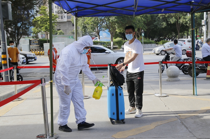 返校前學(xué)生每日通過易班小程序健康信息上報(bào)系統(tǒng)填報(bào)個(gè)人健康狀況及行程軌跡。返校當(dāng)天,所有同學(xué)在現(xiàn)場工作人員的指引下,依次有序完成了更換口罩、測量體溫、行李和手部消毒、核查健康碼(綠碼)、身份核實(shí)等流程。