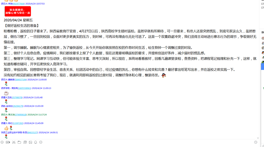 撰寫(xiě)“兩封書(shū)信”,傾情守護(hù)凝心聚力。131日,學(xué)校發(fā)出《給湖北籍西石大學(xué)子的一封信》,向身處疫區(qū)中心的學(xué)生送去母校的牽掛與撫慰,與湖北籍學(xué)生及家人一起抗疫。26日,發(fā)布《給陜西高校班級(jí)心理委員的倡議書(shū)》,并通過(guò)陜西省委教育工作委員會(huì)轉(zhuǎn)發(fā)全省各高校,鼓勵(lì)廣大學(xué)生骨干充分發(fā)揮朋輩優(yōu)勢(shì),攜手互助,建立戰(zhàn)“疫”情境中的心理互助,在國(guó)家危機(jī)時(shí)洋溢青春的力量。