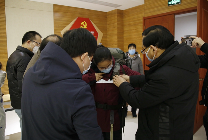宋彥霞的愛人是馬克思主義學院綜合辦公室主任高亮老師,他在送別現(xiàn)場幾度哽咽。他說:“這段時間我會在家里全力照顧好老人和孩子,解除愛人的后顧之憂,我為愛人的勇敢感到驕傲!”