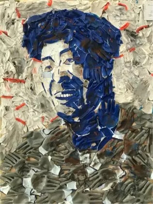 這幅作品的創(chuàng)作靈感來源為王進(jìn)喜的照片,以此表示對(duì)王進(jìn)喜的敬佩;同時(shí)用手套代表勞動(dòng)者,表現(xiàn)勞動(dòng)者的無私奉獻(xiàn)和偉大。通過做舊的手法使整幅作品更加具有年代感和歷史韻味,繼而體現(xiàn)勞動(dòng)的艱辛以及鐵人精神的偉大。