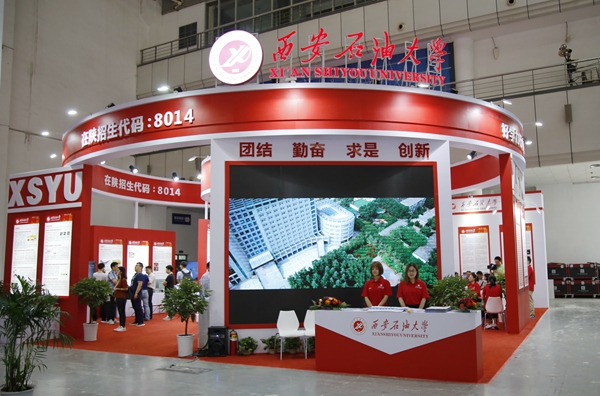 我校展區(qū)位于曲江國際會展中心核心展區(qū)A館,共有37項科研成果、15項研究生創(chuàng)新成果參展。展臺設計采用彩色圖文展板、科研成果實物展品、LED顯示、宣傳彩頁等多種形式,全方位展示了我校文化建設成果、教育扶貧成果、“互聯(lián)網+”大學生創(chuàng)新創(chuàng)業(yè)成果、科技成果及研究生創(chuàng)新成果,并著重突出了石油石化特色。為做好參展工作,由教務處牽頭,科技處、研究生院及相關職能處室通力合作、積極準備,按時提交資料,確保各項成果順利展出。各院(系)教師代表、招生辦公室工作人員、學生志愿者經過認真地培訓學習,在展會上為廣大家長、學生提供了完善細致的信息咨詢服務。