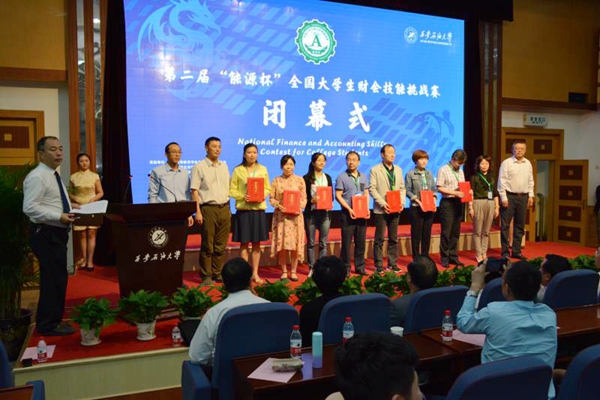 頒獎典禮上,張國才副理事長、李天太副校長為特等獎獲得者頒獎。中國石油集團石油管道工程技術(shù)研究院院長、黨委書記劉亞旭,廣東財經(jīng)大學(xué)原校長王華為一等獎獲得者頒獎。西安電子科技大學(xué)總會計師謝軍占、陜西延長石油(集團)有限責(zé)任公司總會計師康永智為二等獎獲得者頒獎。我校原總會計師楊恒倉、經(jīng)管院教授趙選民、廣州市福斯特科技有限公司董事長閆曉霞為三等獎獲得者頒獎。陜西省國稅局科研所副所長劉峰、圓通制創(chuàng)立者王民權(quán)、中國節(jié)能環(huán)保裝備股份有限公司財務(wù)總監(jiān)李強、廣州市福斯特科技有限公司總經(jīng)理楊帆為優(yōu)秀組織獎獲得單位頒獎。我校實驗室管理處處長孟開元、經(jīng)濟管理學(xué)院黨委書記閆大維、經(jīng)濟管理學(xué)院院長王君萍、教務(wù)處副處長張君濤為優(yōu)秀指導(dǎo)教師頒獎。