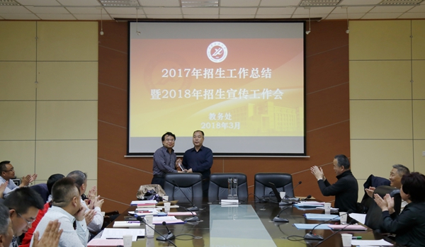 3月28日下午,我校在雁塔校區(qū)第一會(huì)議室召開了2017年招生工作總結(jié)暨2018年招生宣傳工作會(huì)。陳軍斌副校長主持會(huì)議,教務(wù)處、各院(系)及相關(guān)職能處室負(fù)責(zé)人參加了會(huì)議。