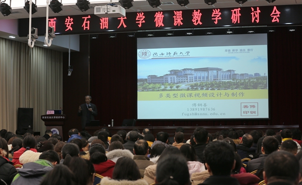 此次會議包含了五場分講座。國家級教學名師、陜西師范大學傅鋼善教授,教育部第二屆高校教師微課教學大賽終審評委、華東師范大學汪曉東副教授,陜西省首屆高校微課教學比賽一等獎、西安工程大學王小紅副教授,超星集團信息化教學培訓師許月女士及課程制作工程師成誠先生,分別從微課的內涵與特點、微課設計與制作、參賽心得分享、參賽評審標準、課件技術支持、典型案例賞析等方面,為與會教師進行了系統(tǒng)全面地介紹。