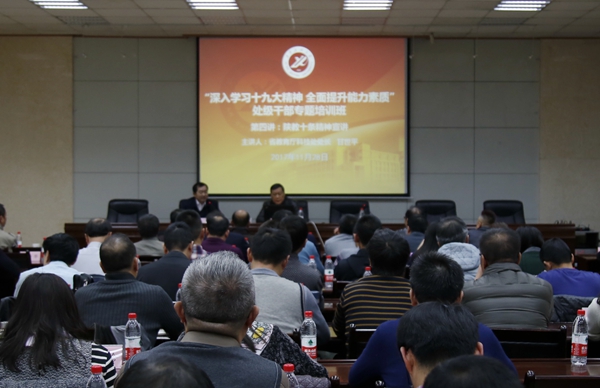 11月28日下午,我?!吧钊雽W(xué)習(xí)黨的十九大精神,全面提升能力素質(zhì)”處級干部專題培訓(xùn)班第四講在雁塔校區(qū)會議中心第三會議室舉辦。省教育廳科技處處長甘世平應(yīng)邀來校作報告,副校長李天太主持報告會,全校處級干部參加報告會。
