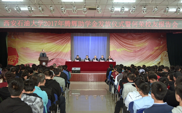 11月10日下午,我校2017年騰輝助學(xué)金發(fā)放儀式暨何榮校友報告會在鄠邑校區(qū)騰輝大學(xué)生活動中心舉行。校黨委副書記張木,我校校友、西安騰輝電器有限公司總經(jīng)理何榮出席活動。學(xué)生工作處、合作發(fā)展處、機械工程學(xué)院負責(zé)人,騰輝公司10余名員工及600余名學(xué)生參加了活動。