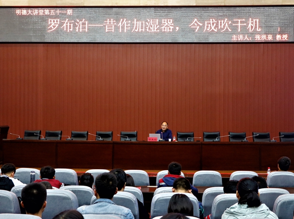 張教授以黨的十九大提出的建設美麗中國為切入點,由此引入塔里木盆地羅布泊的干旱沙漠化現(xiàn)象。他列舉了歷史上羅布泊水文現(xiàn)象的演變,指出羅布泊逐漸消失的原因正是高原雨影效應造成的西北干旱沙漠化。經(jīng)過多年的研究,張教授提出了恢復羅布泊生態(tài)的措施——現(xiàn)代坎兒井和青藏水引流,使得羅布泊地區(qū)的生態(tài)環(huán)境有所改善。張教授還介紹了自己正在編寫的《于無聲處——華夏云泉羅布泊》一書,希望以此來引起大家對羅布泊環(huán)境現(xiàn)狀的關注。通過此次講座,同學們了解了西北地區(qū)干旱沙漠化的原因,進一步認識到羅布泊消失所帶來的生態(tài)問題。