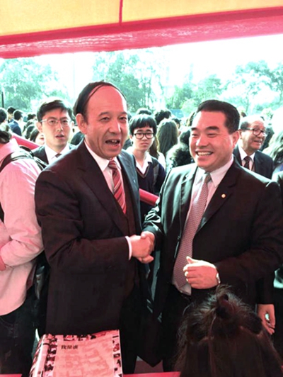 秘魯中資企業(yè)協(xié)會(huì)副會(huì)長(zhǎng)、中石油秘魯國(guó)家公司總經(jīng)理陳金濤到我校展臺(tái)與賽云秀書記親切交談