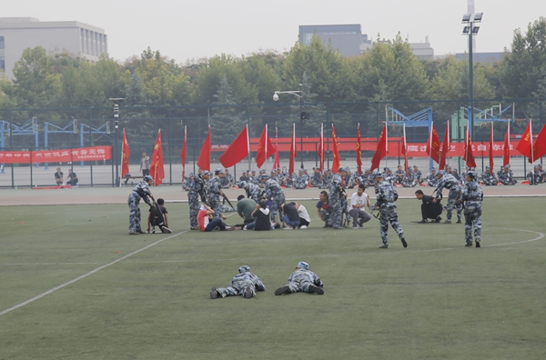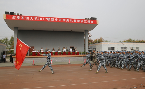 開學典禮暨軍訓匯報會在激昂的國歌聲中拉開了序幕。伴隨著嘹亮的口號,2017級新生們在各院(系)輔導員的帶領下邁著整齊矯健的步伐,精神飽滿地經過主席臺,接受校領導的檢閱。隨后,新生們還進行了擒敵拳方陣、武警舞步操方陣、匕首操方陣、舞旗擒敵配套方陣、戰(zhàn)術解救人質演習、石油學子花樣隊形等科目的表演。