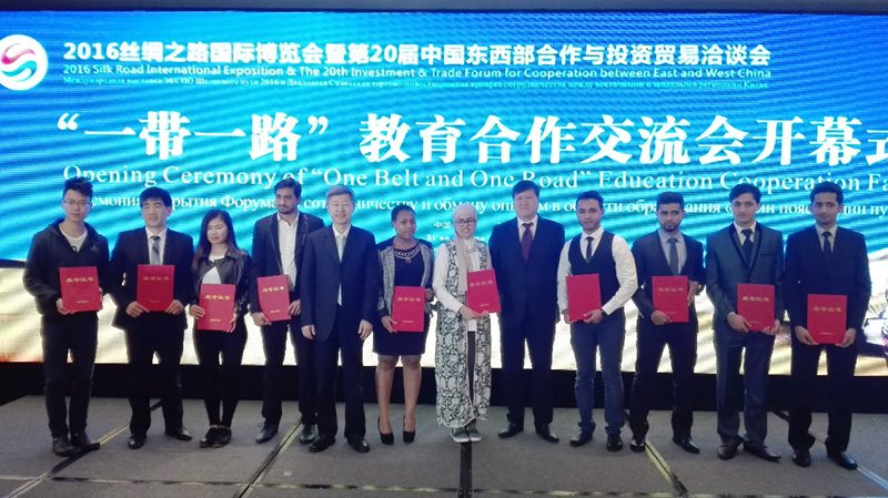 5月13日下午,2016絲綢之路國際博覽會(huì)“一帶一路”教育合作交流會(huì)開幕式在西安喜來登酒店舉行。陳軍斌副校長(zhǎng)作為受邀嘉賓出席開幕式,我校獲得“三秦外國留學(xué)生獎(jiǎng)學(xué)金”的留學(xué)生代表上臺(tái)領(lǐng)獎(jiǎng)。