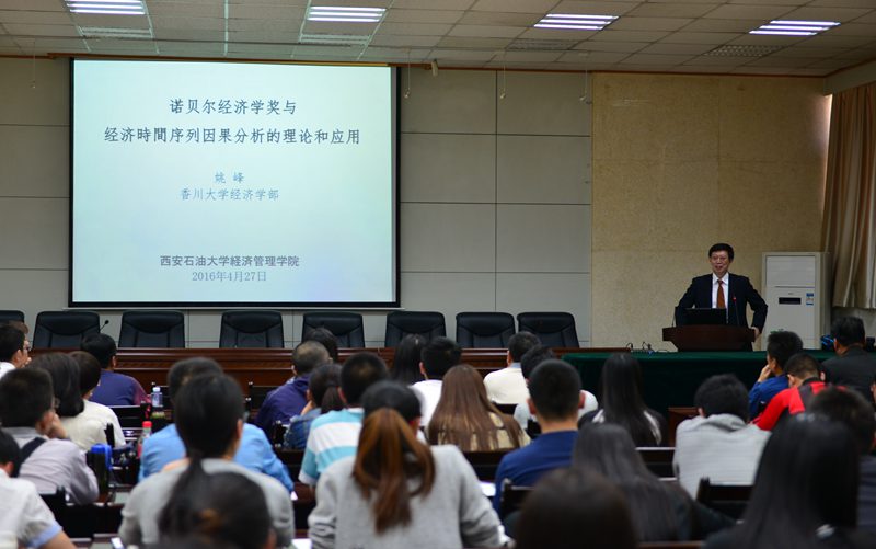 隨后,姚峰教授在第三會(huì)議室為我校師生作了題為《諾貝爾經(jīng)濟(jì)學(xué)獎(jiǎng)與經(jīng)濟(jì)時(shí)間序列因果分析的理論和應(yīng)用》的學(xué)術(shù)報(bào)告。