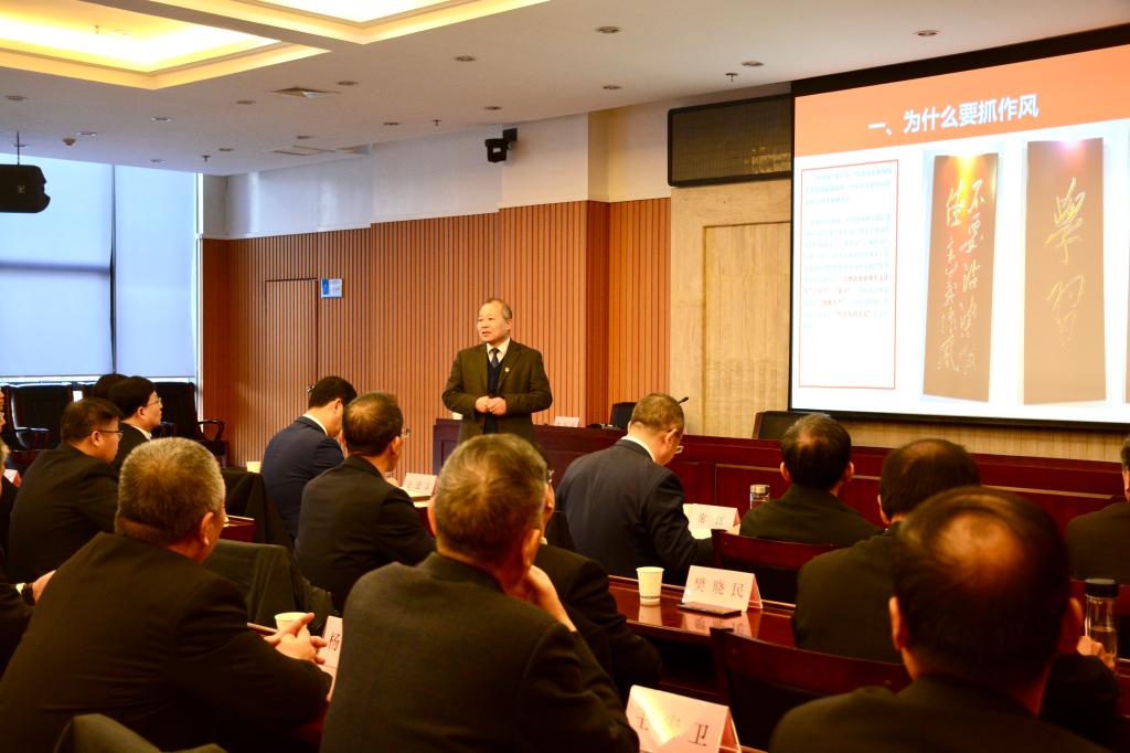 參觀結(jié)束后,全體同志來到圖書館第一會議室。校鐵人精神研究中心研究員郭崗彥為大家作《作風(fēng)與使命》專題報(bào)告,校黨委書記常江主持報(bào)告會。郭崗彥深入講解了延安整風(fēng)所取得的明顯成效以及作為作風(fēng)建設(shè)源頭活水的重大意義,介紹了大慶石油會戰(zhàn)靠“兩論”起家、“兩分法”前進(jìn)的背景和效果,用生動的故事、躬身研究的珍藏,深刻闡釋了大慶精神的歷史定位、豐富內(nèi)涵和時(shí)代價(jià)值,展現(xiàn)了石油人縱橫千里、叱咤油田的恢弘氣勢和英雄形象。他進(jìn)一步講解了大慶會戰(zhàn)對加強(qiáng)作風(fēng)建設(shè)的高度重視,介紹了對干部工作作風(fēng)“三個(gè)面向”“五到現(xiàn)場”“約法三章”的基本要求,對工人工作作風(fēng)“四個(gè)一樣”“三老四嚴(yán)”的基本要求,引用余秋里關(guān)于“培養(yǎng)作風(fēng)實(shí)際上就是培養(yǎng)隊(duì)伍戰(zhàn)斗力”的論述,展開闡述了“嚴(yán)細(xì)準(zhǔn)狠”的關(guān)鍵作用。