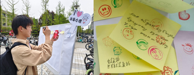 心理協(xié)會組織的“以德育心”展臺主題為“尋找缺失的一角”,引導(dǎo)同學(xué)們發(fā)掘優(yōu)勢,探索目標(biāo),找準(zhǔn)個人發(fā)展方向;“以美潤心”展臺主題為“眾人涂鴉”和“詩歌拼貼”,同學(xué)們通過活動打破性別刻板印象,在創(chuàng)造中展示個人風(fēng)采。