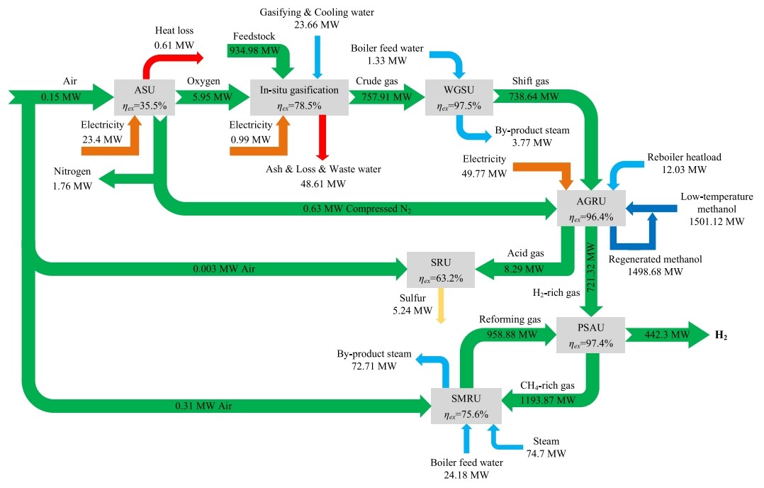 深部煤炭原位氣化制氫作為一種潛在的規(guī)?;夹g(shù)路線,工業(yè)化應(yīng)用前利用熱力學(xué)手段分析其能量轉(zhuǎn)化、利用過程的特點(diǎn),預(yù)測系統(tǒng)用能的薄弱環(huán)節(jié),可為后續(xù)工藝過程、工藝參數(shù)耦合優(yōu)化提供指導(dǎo)。與現(xiàn)有基于化石能源路線間效率、經(jīng)濟(jì)性等方面的定量化分析是提高競爭力,明確技術(shù)可行性與應(yīng)用前景的核心關(guān)鍵。