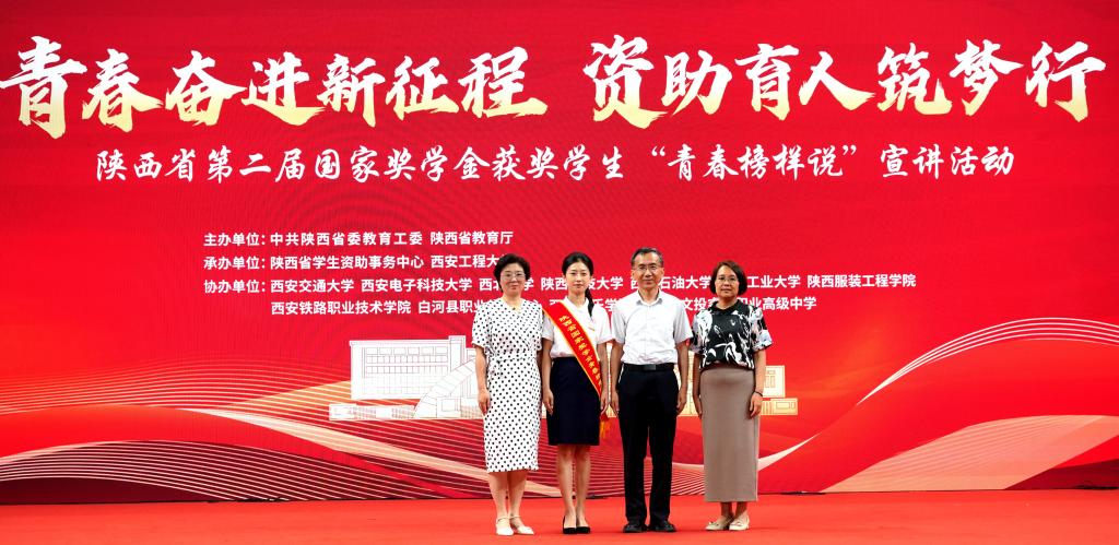 活動現(xiàn)場,省委教育工委、省教育廳總會計師劉宏恩宣讀陜西省第二屆國家獎學(xué)金“青春榜樣說”成員名單和提名人選名單。教育部全國學(xué)生資助管理中心副主任涂義才、省委教育工委委員、省教育廳副廳長何玉麒為“青春榜樣說”成員頒發(fā)聘書。