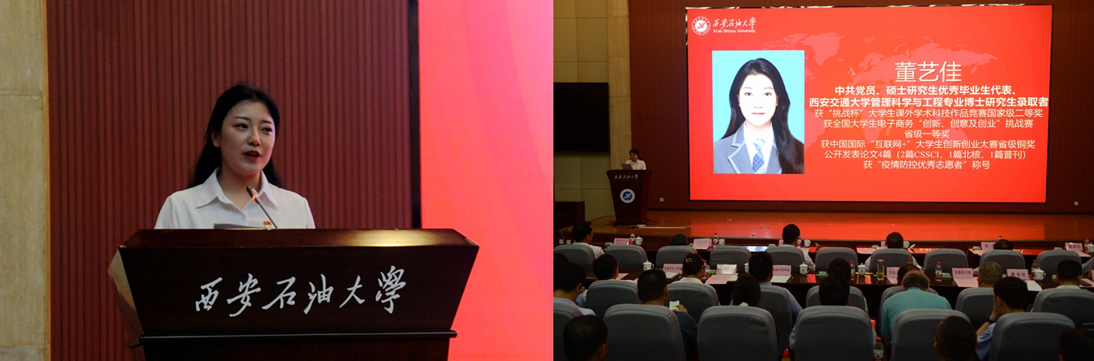 中共黨員、陜西省大學生自強之星、陜西好青年榮譽稱號獲得者,石油工程學院學生梁歡;本科優(yōu)秀畢業(yè)生代表、北京大學石油地質學專業(yè)碩士研究生錄取者,地球科學與工程學院學生劉偉;國際學生本科優(yōu)秀畢業(yè)生代表、哈薩克斯坦籍留學生,國際教育學院學生亞歷山大;中共黨員、碩士研究生優(yōu)秀畢業(yè)生代表、西安交通大學管理科學與工程專業(yè)博士研究生錄取者,經濟管理學院學生董藝佳;中共黨員、衛(wèi)國戍邊退役畢業(yè)生代表、西部基層就業(yè)優(yōu)秀畢業(yè)生代表,石油工程學院學生劉國棟分別作了交流發(fā)言。