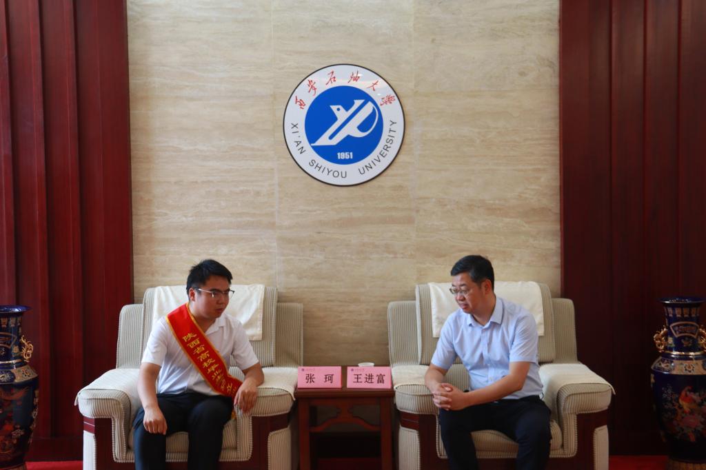 會(huì)前,校長(zhǎng)王進(jìn)富親切會(huì)見(jiàn)了報(bào)告團(tuán)一行。王進(jìn)富對(duì)5位優(yōu)秀畢業(yè)生代表來(lái)校作報(bào)告表示歡迎和感謝,對(duì)他們?cè)鶎印?bào)效祖國(guó)、服務(wù)人民的先進(jìn)事跡表示贊揚(yáng)與肯定。他指出,畢業(yè)生建功立業(yè)先進(jìn)事跡報(bào)告活動(dòng)的舉辦,就是以先進(jìn)榜樣為力量,引領(lǐng)廣大學(xué)生樹(shù)立正確的學(xué)習(xí)觀、就業(yè)觀和人生觀,立志做有理想、敢擔(dān)當(dāng)、能吃苦、肯奮斗的新時(shí)代好青年。他表示,學(xué)校將以此次分享會(huì)為契機(jī),充分挖掘?qū)W校優(yōu)秀校友先進(jìn)事跡,引導(dǎo)廣大同學(xué)向身邊的榜樣和先進(jìn)看齊,賡續(xù)紅色血脈,弘揚(yáng)鐵人精神,在新時(shí)代的廣闊天地綻放青春之花,同時(shí)也希望校友張珂(我校石工院2019屆本科畢業(yè)生)能夠一如既往地支持母校發(fā)展。