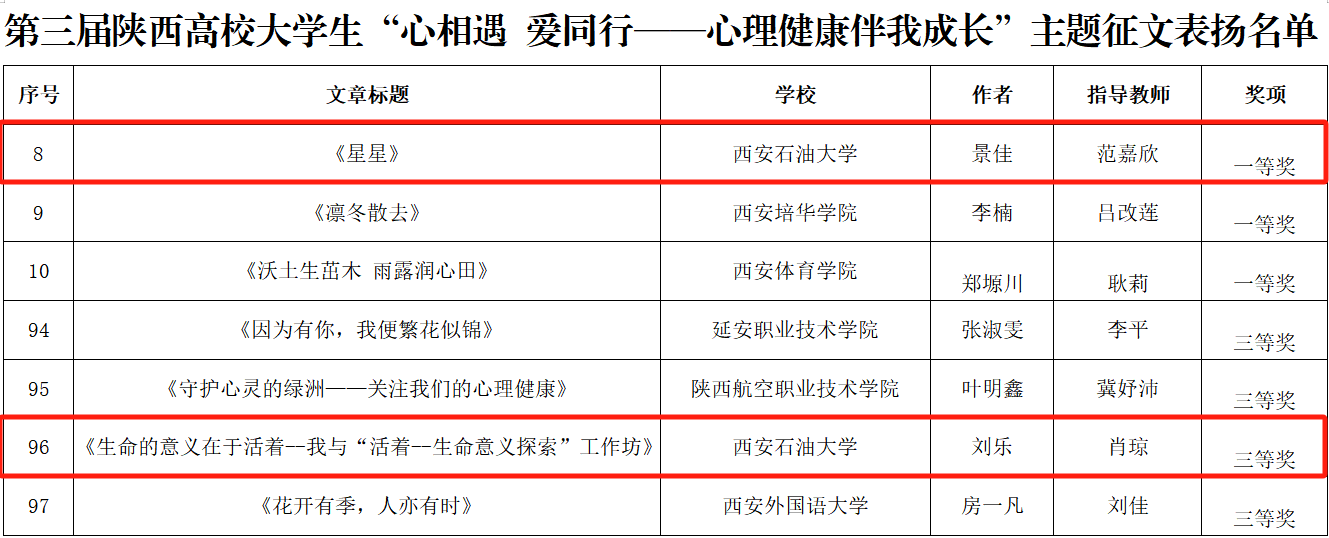 其中,在第九屆陜西高校心理健康教育指導(dǎo)典型案例比賽中,我校學(xué)生工作部(處)(學(xué)生心理成長指導(dǎo)中心)(以下簡稱“心理中心”)焦文潔、趙晶兩位老師分別榮獲一等獎和二等獎;在第三屆陜西高校學(xué)生心理健康教育課程教學(xué)展示活動中,心理中心魏曉言老師榮獲“教學(xué)骨干”稱號;在第三屆陜西高校大學(xué)生“心相遇愛同行——心理健康伴我成長”主題征文活動中,范嘉欣老師指導(dǎo)學(xué)生景佳的作品《星星》獲得一等獎,心理中心肖瓊老師指導(dǎo)學(xué)生劉樂的作品《生命的意義在于活著—我與“活著—生命意義探索”工作坊》獲三等獎。